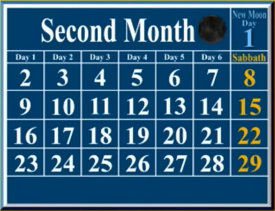 From the dates previously mentioned following the New Moon Day, the rest of the dates for the entire second month can be extrapolated in both directions to establish all the dates of the 2nd month and verifying that the 7th day Sabbaths of each week fell on the 8th, 15th, 22nd, and 29th days exactly the same as the first month established by the Exodus.