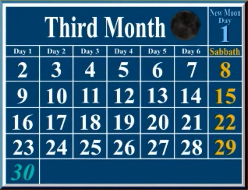 Once more, when the 15th of the month is a 7th day Sabbath, the rest of the dates can be supplied as before to establish all the dates of the 3rd month. Once more, this demonstrates a lunar month with the first day being New Moon Day. Thus the Sabbath days are the same as the previous two months being the 8th, 15th, 22nd, and 29th.