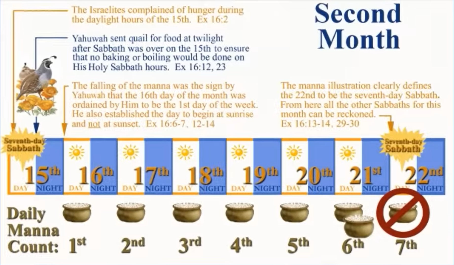 The Israelites were to gather one omer (a day measure) per person each day for five days. On the 6th day, they were to gather a double portion for that day and the next day which was the 7th day Sabbath. Scripture clearly established that manna was given on the 16th day of the 2nd month. Therefore, at the end of that week, the 7th day Sabbath fell on the 22nd day of the 2nd month.