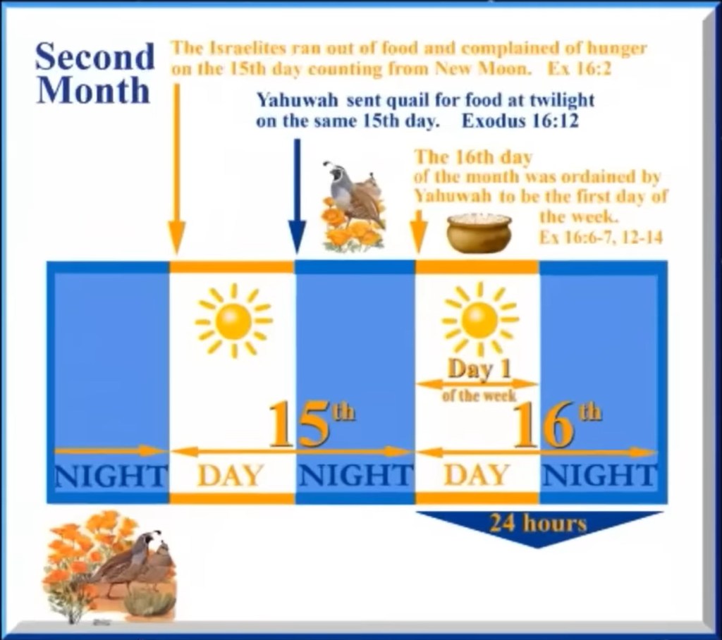 On the second month, the LORD sent quail followed by manna the next morning. The dates given in scripture reveal that the 2nd month was identical in format to the 1st month: