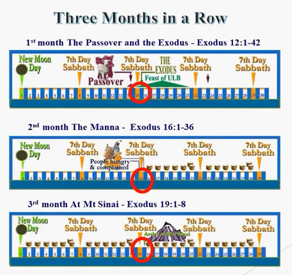 The lunar months in the LORD’s calendar are anchored to a solar year beginning with the New Moon day, a worship day. Six work days follow with the Sabbath always falling on the 8th, 15th, 22nd, and 29th day of the month. This weekly cycle resets and restarts with each new moon. The Bible records events of The Exodus, The Manna, and Mount Sinai, establishing the LORD’s lunar calendar with three identical consecutive months, something which is impossible on our modern solar calendar: